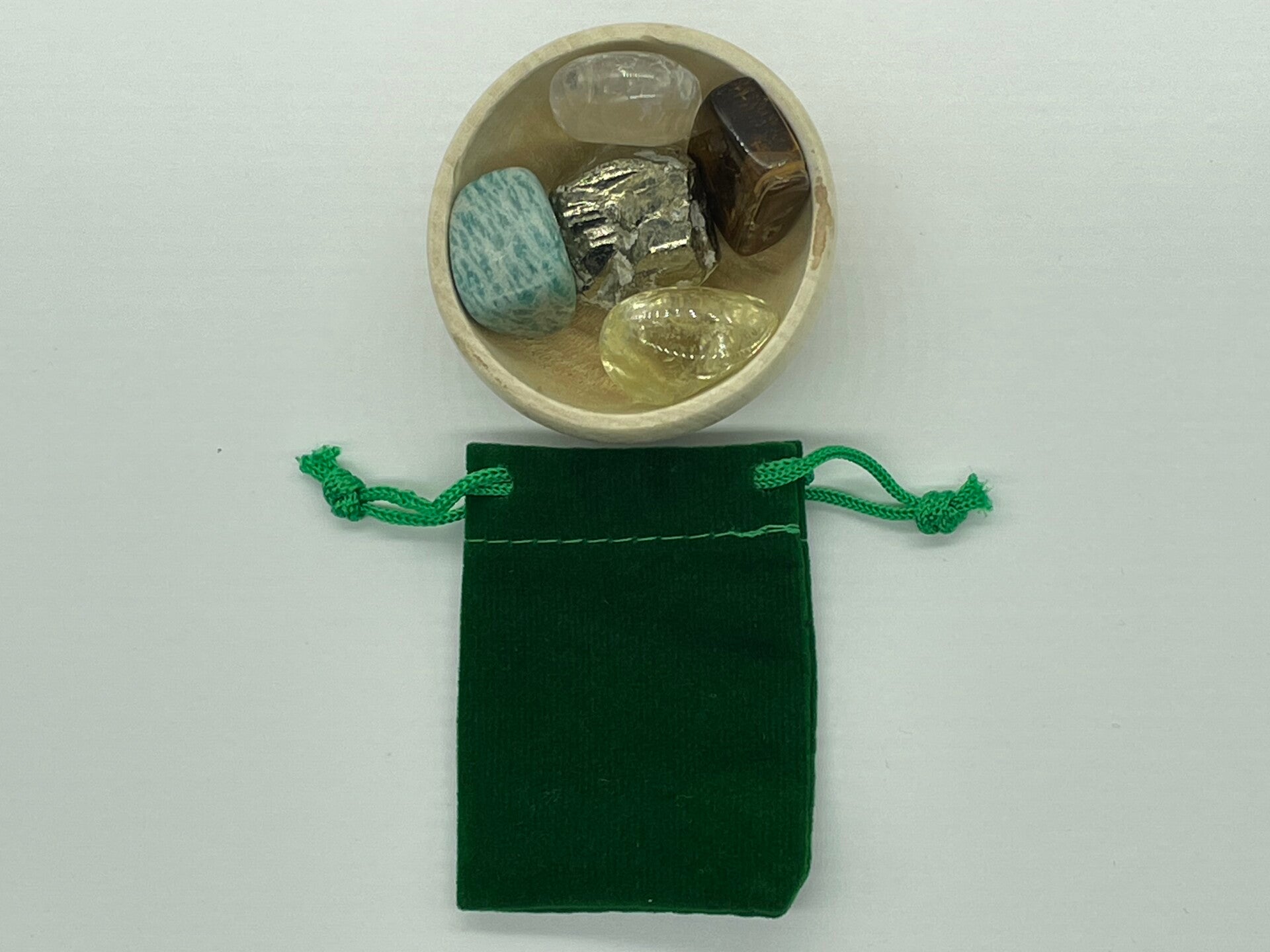 This magical little wooden bowl is filled with 5 Beautiful crystals to help manifest abundance in your life. Also included are descriptions of what each crystal means and a small green velvet pouch to carry your crystals with you as well.
